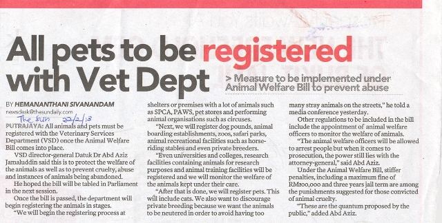 | » | THE SUN | 22 FEB 2013 | Jumaat | All pets to be registered with Vet Dept |