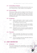 Part 1 | Minimum Standards of Construction of Poultry Processing Premises 2.11 Further Ef uent Treatment Any additional ef uent treatment facilities should be located so as not to create an odour or other nuisance to processing areas. 2.12 Electrical Fittings Electrical pipe ttings should be installed at least 25mm from equipment or walls. Other electrical ttings such as switches, ducts, cable ladders and switches should be sealed to the wall or suf ciently clear to permit effective cleaning of the space between the tting and the wall. 2.13 Refrigeration 2.13.1 Where condensation is likely to lead to product contamination, effective means to con ne and remove the condensation should be provided. 2.13.2 Where overhead refrigeration facilities are installed, insulated drip pans, directly connected to the drainage system, should be placed beneath them. 2.13.3 Refrigeration motors should be located outside the premises except for other than a sealed unit which is an integral part of an appliance. 2.14 Pneumatics 2.14.1 Where practicable, the exhaust from air operated equipment should be piped to the exterior of processing buildings. 2.14.2 Oil from air exhausts should be adequately trapped to prevent contamination of product. 3.0 BASIC CONSTRUCTION 3.1 Introduction This section describes basic requirements to ensure sanitary construction of the interiors of production areas using acceptable non-toxic materials. 9