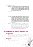 Part 1 | Minimum Standards of Construction of Poultry Processing Premises 10.17 Equipment Washing 10.17.1 An equipment washing area independently drained and adequately ventilated should be available in a part of the premises set aside for that purpose. This area should be separated from processing, packing and storage sections but with direct communication. 10.17.2 The dimensions of the washing area should be commensurate with the operations of the premises and the number of product containers used for delivery purposes. 10.17.3 A wash up trough of adequate size to allow immersion of containers, trays, utensils and other portable equipment normally used in the premises should be provided. A permanent and adequate supply of hot and cold running water should be laid onto the trough. Racks for air drying of containers, trays, utensils and other equipment should be provided. 10.17.4 Automatic washing machines used in the cleaning of product containers should operate in a way which ensures that a continual ow of potable water is maintained. Where recycled water is used in such machines, an approved process which ensures that potability is maintained at all times should be in operation. 11.0 FURTHER PROCESS PRODUCTS PRODUCTION AREA 11.1 Introduction This section covers processed poultry products other than canned poultry products and includes poultry that is subject to curing, smoking, cooking and poultry containing additives. 11.2 Location Further process products operations should be located in an edible product section of the premises. 35